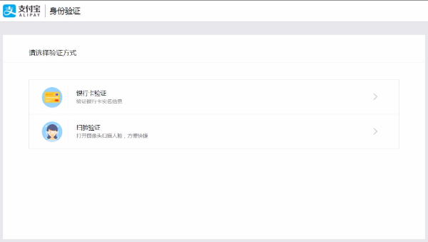 身份信息确认页成功后,系统识别是否需继续用快捷“银行卡验证”or“扫脸验证”的方式;如需要,则显示“银行卡”or“扫脸验证”;如果不需要,是提示“身份信息已完善”,具体以前台页面显示为准