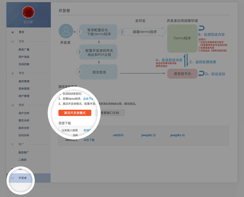 第一次进入开发者模式,可以先查看开发者文档或者直接激活开发者模式。