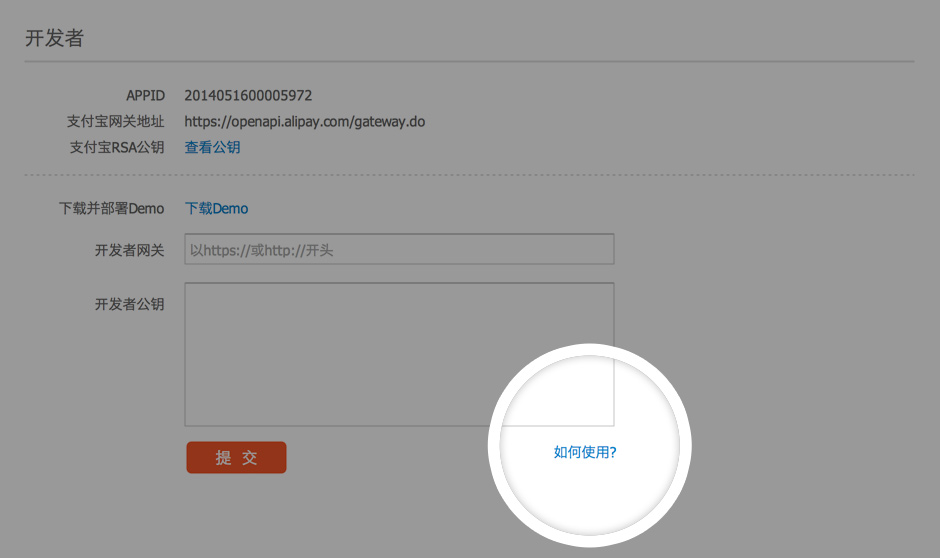 点击“激活开发者模式”,可以获知APPID、支付宝网关地址和支付宝RSA公钥,并需要填入您自己网关和密钥。如果对如何生成密钥不熟悉,可以点击“如何使用?”,了解密钥生成办法。